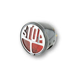 Jaunākā apgaismojuma tehnoloģija melnā metāla korpusā ar hromētu STOP emblēmu un numura zīmes apgaismojumu, E tests