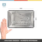 Praktiska un krāsaina: izturīga metāla zīme DIN A4 formātā ar izliekumu, motīvu reljefu un iepriekš izurbtiem caurumiem ērtai piestiprināšanai pie sienas